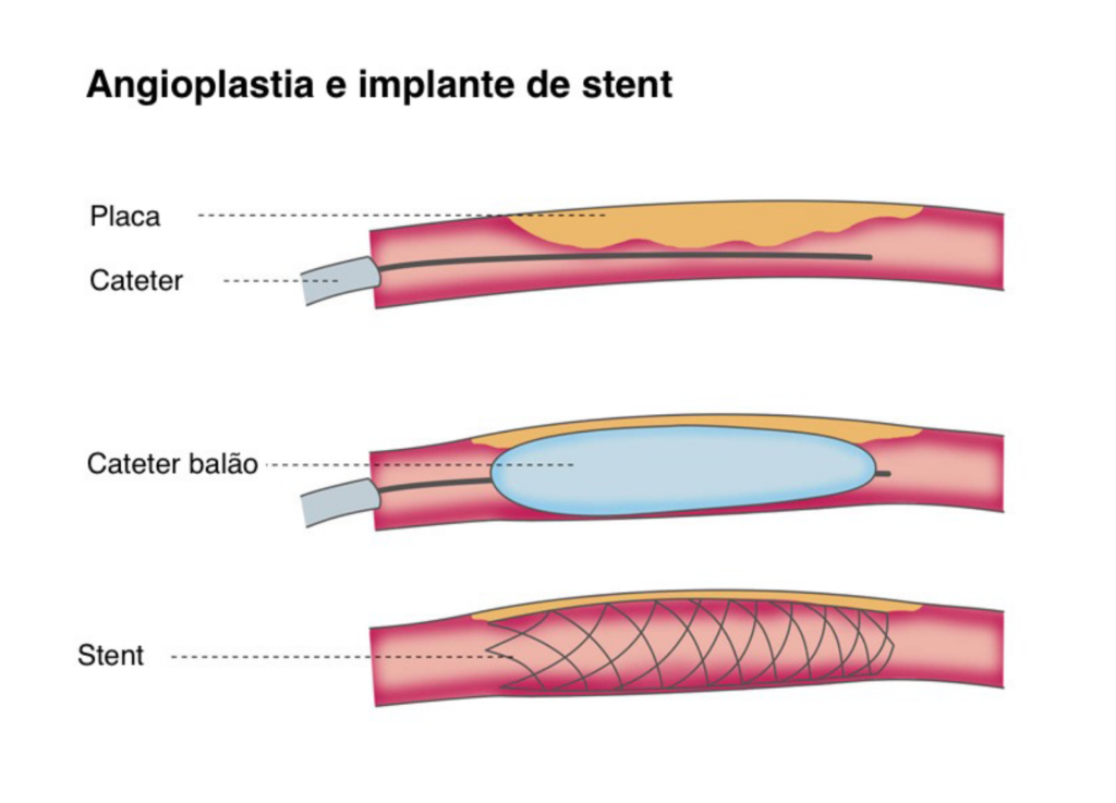 O procedimento geralmente envolve a colocação de um stent para manter a artéria aberta. Equipamentos como cateteres, fios-guia e dispositivos de imagem por fluoroscopia são utilizados para guiar o procedimento.